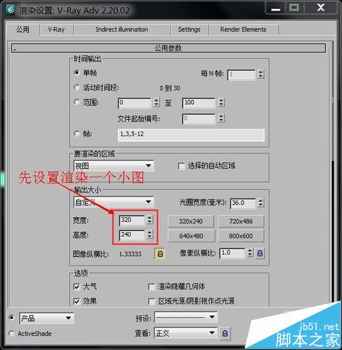 4、然后回到渲染设置的,公共栏,设置一个分辨率低的小图,点渲染。