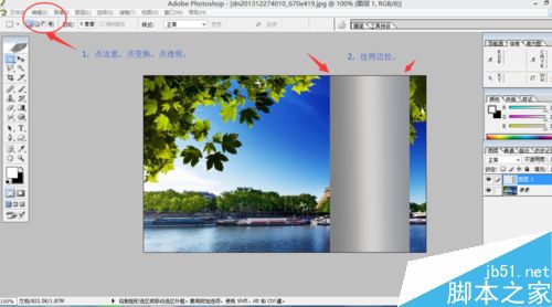 选择编辑里边的变换,选透视;往两边拉,拉完后,按回车;再选编辑里的选转,旋转到如图的效果;按回车。