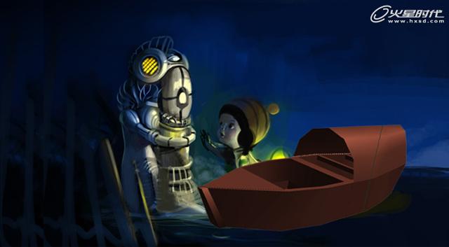 第2天发现构图不够饱满,气氛有点压抑,然后到ps里面调整了一下画布大小,做了修改,这次有了一些新的想法,把平地改成了水,孩子坐在了船上,机器人半蹲在水里,在孩子背面做了一个灯光,让整个画面更有神秘感,前景加了一些栅栏,加深画面前后关系,构图做了大面积的修改。