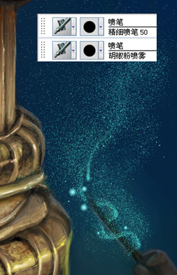 继续刻画前景的铁笼,绘制船和机器的倒影,右边的树慢慢把结构画出来,给孩子手上的魔法棒做一些魔法效果,这里我用了喷笔里面的变体笔刷,可以方便的画出一闪一闪的效果。(图13、14)