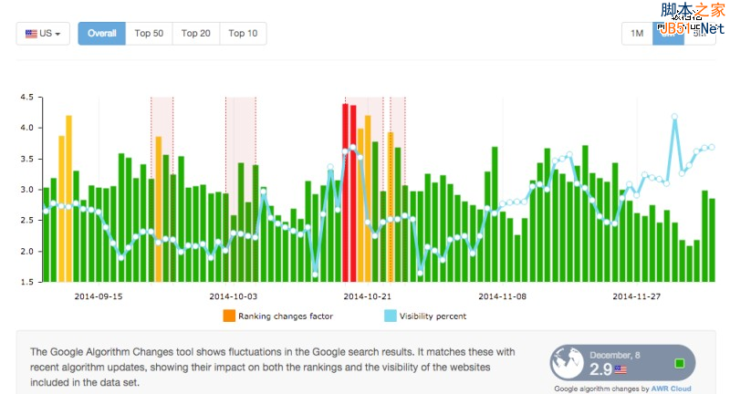 上图中的Overall部分就是通过特定算法计算得出的网站排名变化系数。而TOP 10-50部分表示与之前数据相比网站排名有浮动的站点数量、以及百分比(网站排名有受到影响的站点与所有网站的比例)。