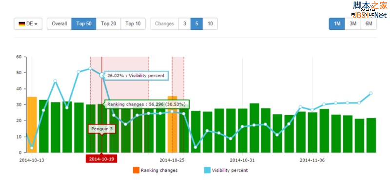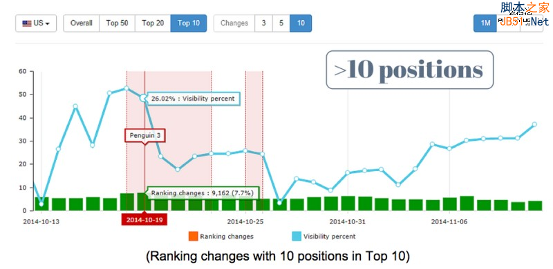 由于企鹅算法3.0是慢慢发布,其他地区、国家(除美国之外)发布时间稍晚于美国。比如英国谷歌搜索排名变动最显著的时间是在10月20日: