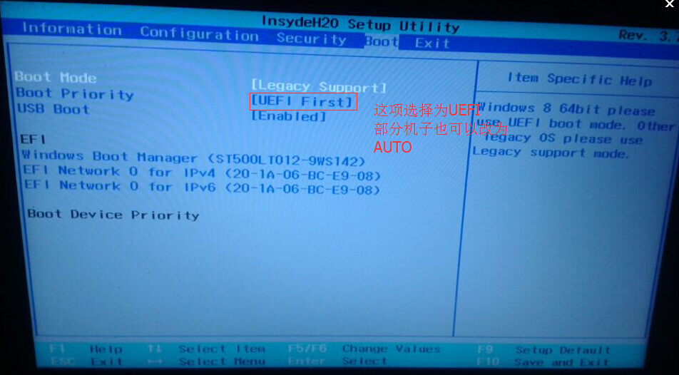 boot mode项中第一项改成了legacy support boot priority项中的选择为:UEFI First或AUTO部分机子有AUTO也可以选择为自动,没有的选择成UEFI做完上述更改后按FN+F10或F10 保存设置 重启进入系统后用黑云一键重装系统。设置完成后就可像普通电脑模式一样选择系统自动安装,设置过主板工具在次提示时,点否就行了,原版WIN8用户建议选择WIN764位 UEFI专版 或WIN864位进行重装。