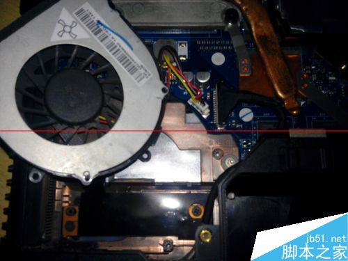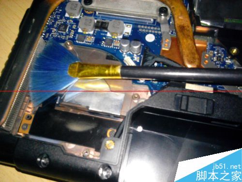 5、拆除风扇后可看见散热管和散热口,可使用小刷子清除散热口处的的赌塞物和灰尘,特别是散热口处容易堆积灰尘导致内部热量无法散出