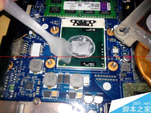 8、使用硅脂涂抹工具均匀的涂抹薄薄的一层,也可以直接涂抹一点然后覆盖之前拆散的覆盖片轻压,也可以将其均匀覆盖,之后重新装机
