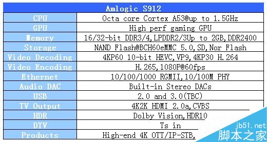 Amlogic S912处理器,该款芯片在还未量产就已经引起了广泛重视,集成64位8核ARM Cortex A53架构,最高频率可达1.5GHz,在高性能的同时可获得更低功耗,能效比甚高,GPU为ARM Mali-T820MP3 GPU,750MHz,适用于处理复杂的用户界面和图像。