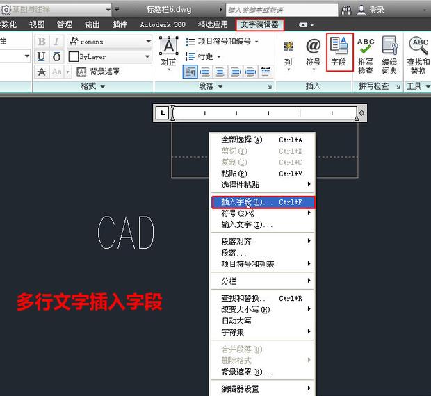 1、如果要把字段插入普通的文字中间,在写单行文字和多行文字时右键,右键中都会有“插入字段”,也可以按快捷键CTRL+F,多行文字编辑器的面板中也有插入字段的按钮。