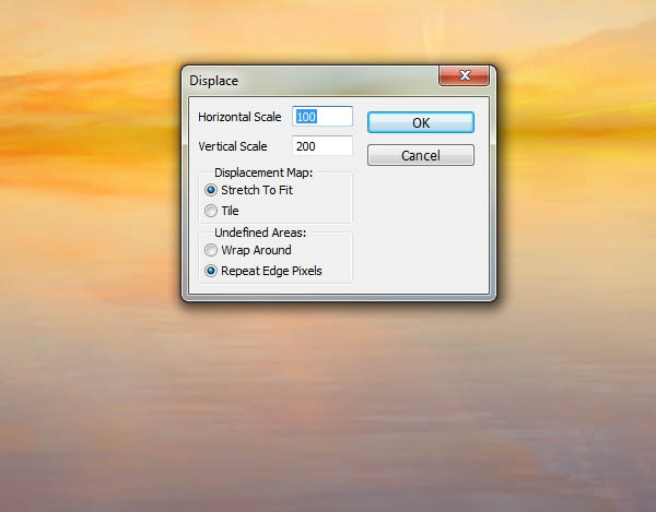 10、为了让湖泊有涟漪效果,滤镜>扭曲>置换,并浏览我们在步骤1中更改创建的纹波文件的设置,置换过滤器来达到你满意的效果。
