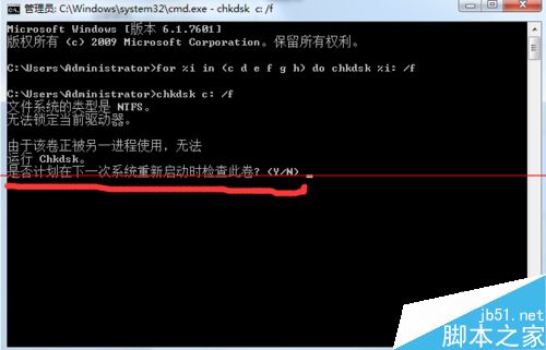 4、点击回车,会发现此时磁盘被占用无法检查,提示我们是否下次开机检查,输入n,点击回车
