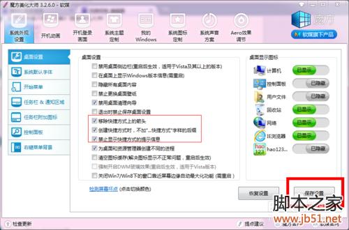 3、在界面的: 移出快捷方式箭头、创建快捷方式不加“快捷方式”字样、禁止显示快捷方式提示信息等前框打上对号