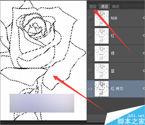 2、通过通道把它的颜色更改为黑色。可以看到这张图片的黑色并不是完全黑色的,这里就先把它的颜色更改为完全的黑色。当点击通道之后,我们选择下面的几个通道。选择其中颜色对比最强烈的通道。这里选择红色的通道。