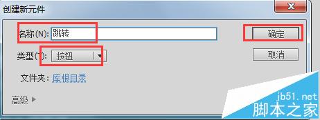 1、使用Flash打开要编辑的文件,插入——新建元件,类型选择按钮,名称更改为跳转(名称可自定),点击确定,并制作按钮。