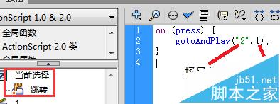 注:在这里gotoAndPlay后面小括号中前面一个在引号内的参数是场景名称,后面一个参数是跳转到该场景的哪一帧。