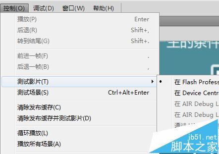 4、然后点击控制——测试影片——测试,测试时不要点击测试场景,测试场景只能测试当前场景的效果,跳转到其它场景的效果是看不到的。