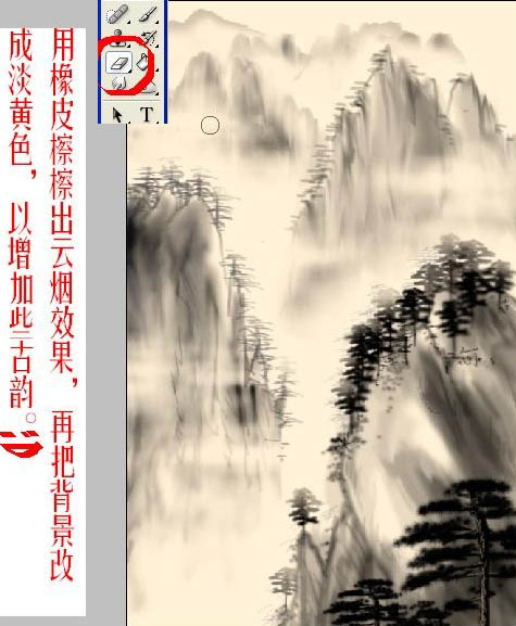 9、用橡皮擦擦出云烟效果,再把背景改成淡黄色,以增加些古韵。