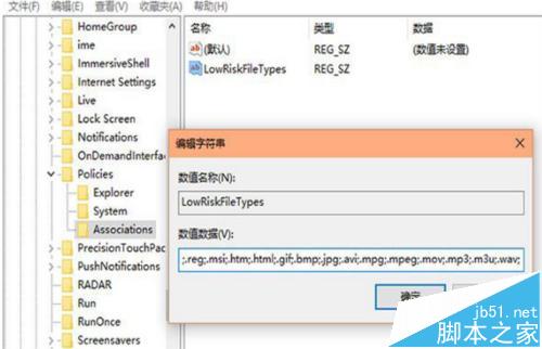 5、双击“LowRiskFileTypes”设置值为 以下数值:.zip;.rar;.nfo;.txt;.exe;.bat;.vbs;.com;.cmd;.reg;.msi;.htm;.html;.gif;.bmp;.jpg;.avi;.mpg;.mpeg;.mov;.mp3;.m3u;.wav;