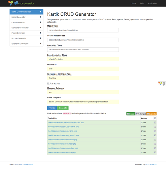 这个插件主要功能是帮助你在使用gii生成代码curd的时候生成kartik-gird的。不需要每次用默认的gii工具生成代码之后再手动添加kartik-gird,这正是我想要的功能。快速生成kartik-grid。