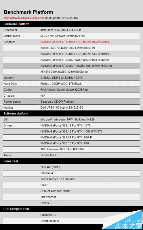 从命名上看GTX 1070显卡取代的显卡是目前的GTX 970,不过后者直接开放了非公版,我们测试过的都是高频非公版,这里对比的是索泰GTX 970至尊OC显卡,核心频率1203MHz,比公版1050MHz高得多。