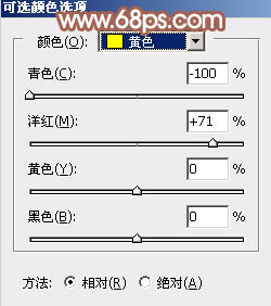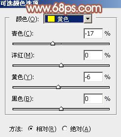 3、创建可选颜色调整图层,对黄色进行调整,参数及效果如下图。这一步把图片中的黄色转为红褐色。