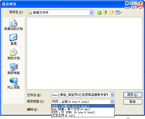 然后在弹出来的对话框中选择你要保存到的文件夹,同时在保存类型上选择“网页,全部(*htm,*html)”,然后点“保存”。这样就可以将这个网页上的所有内容都保存到我们自己的电脑上了,包括图片和一些JS文件等。如下图所示: