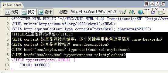 <TITLE>是网站标题,keywords是网页关键字,最后一个description是网页描述。只要将里面的文字内容修改成你自己的就可以了。然后就是修改代码里的CSS文件的路径,找到: