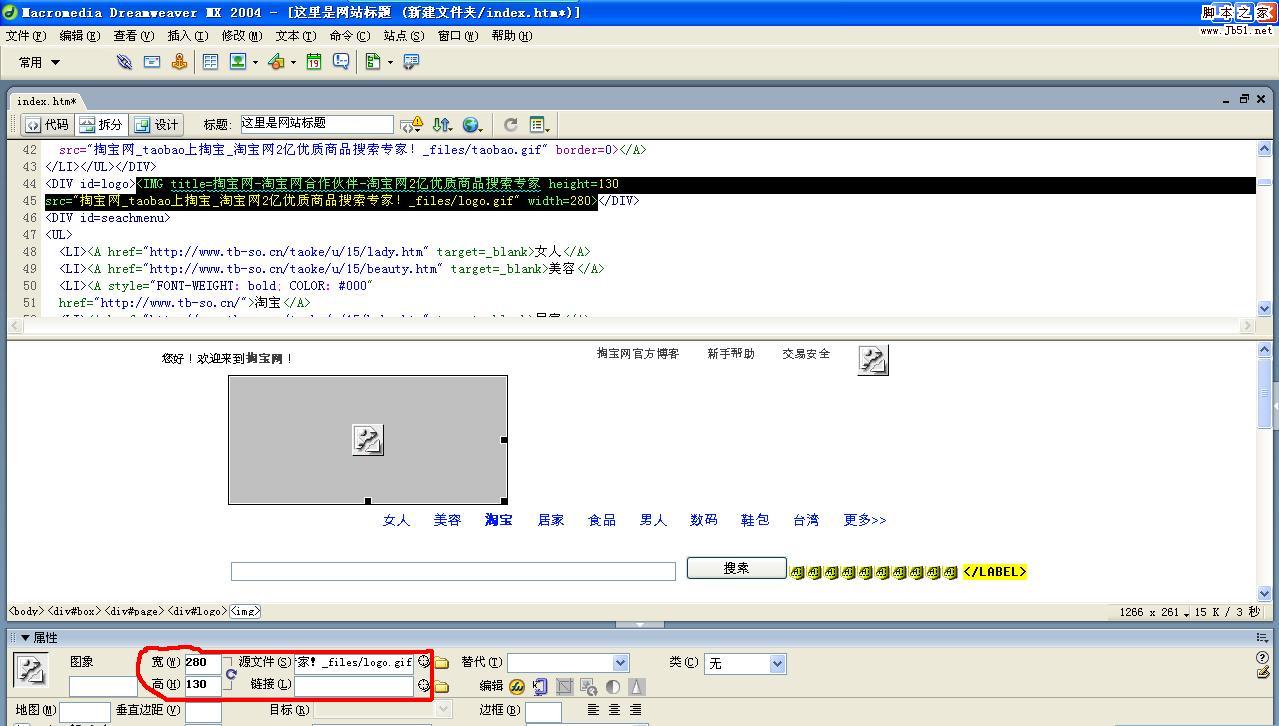 此时你可以通过修改代码来修改图片的地址,也可以通过修改上图中红框内的内容来修改图片的地址。其中“源文件”就是图片的地址,因为我的图片是保存在css文件夹的,所以我将其修改成“css/logo.gif”;下面的“链接”就是这张图片所要链向的地址,我这里不想给这张图片加链接,所以留空,你可以加上链接,如果是链向网络的绝对地址记得要使用带http://的完整地址。修改好后点击“文件”》“保存”,这样就将修改好的保存起来了,用浏览器打开这个网页文件就可以浏览到修改后的样式和内容。