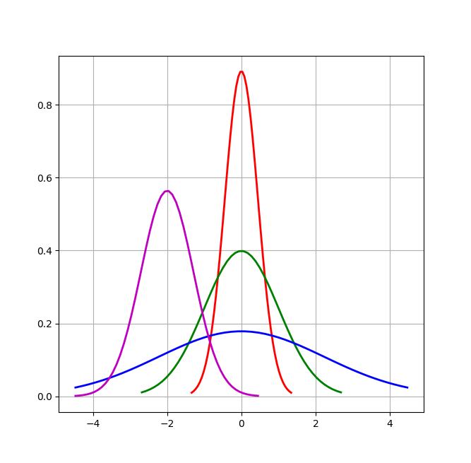 # Python实现正态分布 # 绘制正态分布概率密度函数 u = 0 # 均值μ u01 = -2 sig = math.sqrt(0.2) # 标准差δ sig01 = math.sqrt(1) sig02 = math.sqrt(5) sig_u01 = math.sqrt(0.5) x = np.linspace(u - 3*sig, u + 3*sig, 50) x_01 = np.linspace(u - 6 * sig, u + 6 * sig, 50) x_02 = np.linspace(u - 10 * sig, u + 10 * sig, 50) x_u01 = np.linspace(u - 10 * sig, u + 1 * sig, 50) y_sig = np.exp(-(x - u) ** 2 /(2* sig **2))/(math.sqrt(2*math.pi)*sig) y_sig01 = np.exp(-(x_01 - u) ** 2 /(2* sig01 **2))/(math.sqrt(2*math.pi)*sig01) y_sig02 = np.exp(-(x_02 - u) ** 2 / (2 * sig02 ** 2)) / (math.sqrt(2 * math.pi) * sig02) y_sig_u01 = np.exp(-(x_u01 - u01) ** 2 / (2 * sig_u01 ** 2)) / (math.sqrt(2 * math.pi) * sig_u01) plt.plot(x, y_sig, "r-", linewidth=2) plt.plot(x_01, y_sig01, "g-", linewidth=2) plt.plot(x_02, y_sig02, "b-", linewidth=2) plt.plot(x_u01, y_sig_u01, "m-", linewidth=2) # plt.plot(x, y, 'r-', x, y, 'go', linewidth=2,markersize=8) plt.grid(True) plt.show()