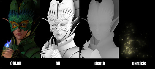 我没有分很多层来渲染这个作品,MASTER层,AO层,深度层和粒子层,然后就合成了。我觉得MAYA统一渲染出的SSS效果比我分开渲各通道合的效果要好,尤其是在阴影上。