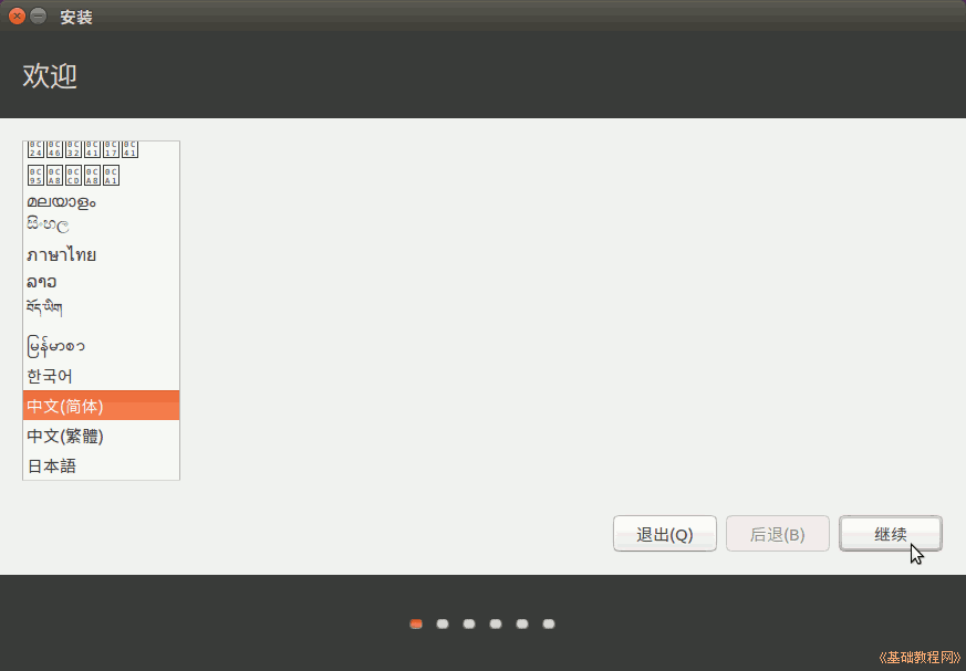 1)双击桌面“安装Ubuntu16.04 LTS”图标,稍等出来一个“欢迎”面板,检查一下左侧栏要选中了“中文(简体)”,