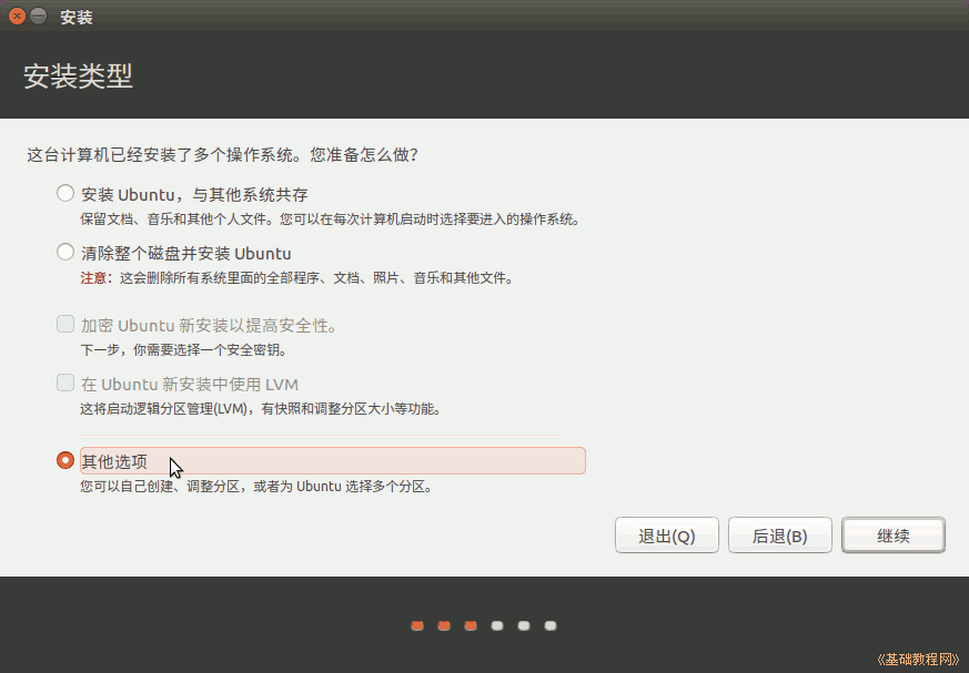 3)接下来第3步是询问安装到哪个分区,选择最下边的“其他选项”,点“继续”按钮;