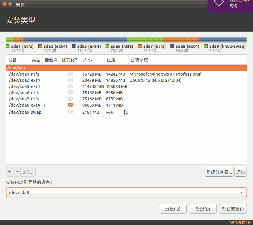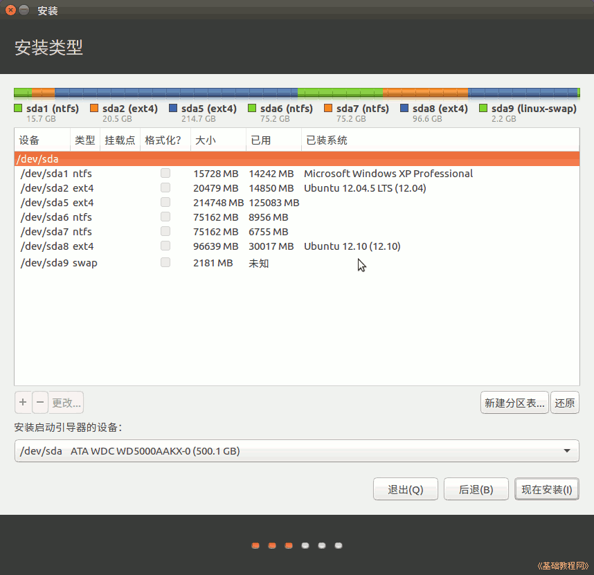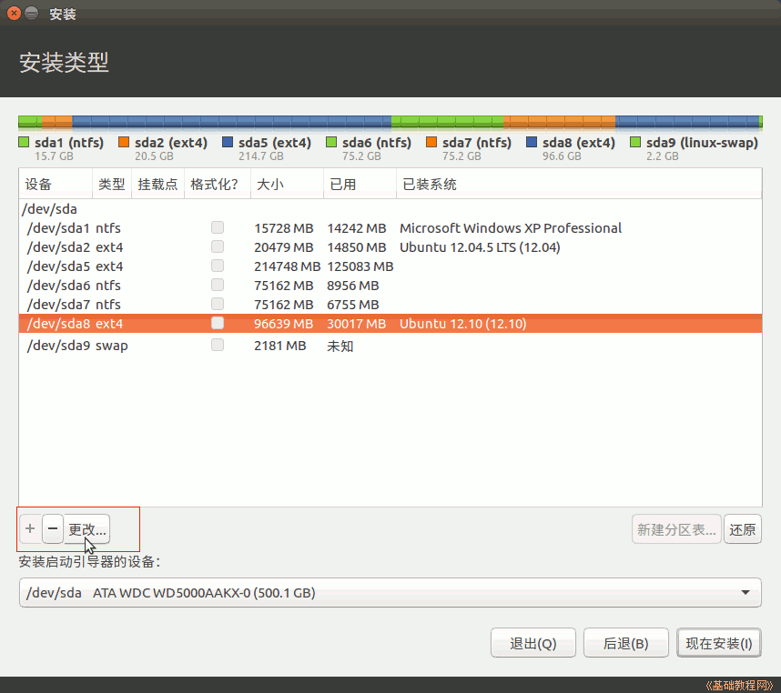 4)接下来出来磁盘分区情况,如果要新建分区和转换分区可以参考前面的第7、13、15、16、19课,这儿是安装到之前12.10的Ext4分区上;