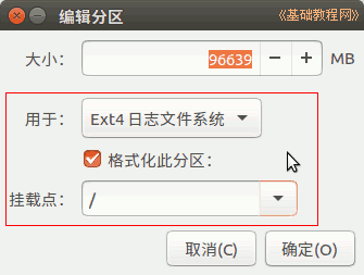 6)在出来的对话框中,设定用于分区的格式Ext4,打勾“格式化”,在“挂载点”右边点一下,选 “/”,点“确定”