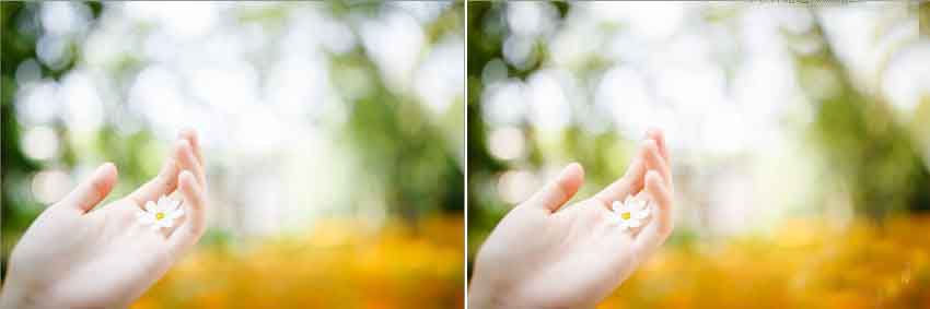 这张照片是在中午前后拍的,那会儿的阳光已经很强,光从后面的树影里透过来,我使用了大光圈将后面背景虚化,让观众的视线集中在少女的手和小白花朵上。原图背景明显偏暗,整体色调偏深,没有夏日的感觉。接下来我们就要使用Lightroom和Photoshop让这张照片蜕变:
