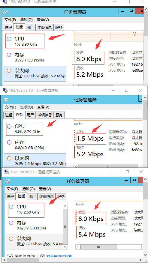 第二,发送的数据大小却完全不一样,这说明处理不一样。我们可以明显看到,192.168.99.10这台服务器,承担了大部分的工作。CPU上升到94%,发送数据包也达到1.5Mbps。