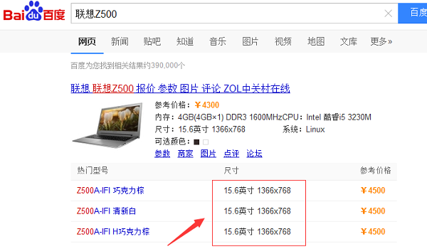 小编目前使用的是联想Z500笔记本,如果小编不知道屏幕尺寸的话,百度一下“联想Z500”然后看参数就知道了,如下图所示。