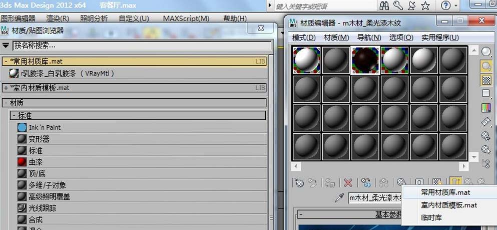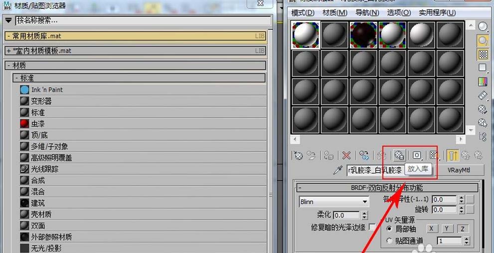 5、如果需要继续保存其材质的话,只需打开之前保存的材质库,然后材质编辑器上点击放入库按钮。