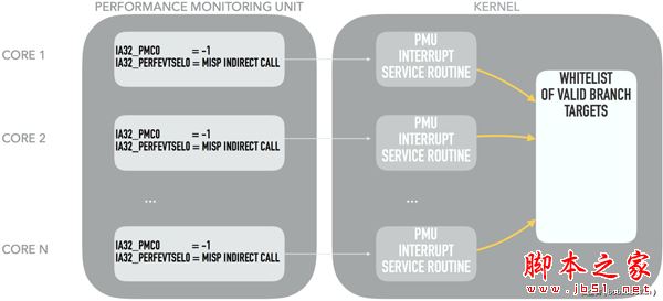 因此,为了精确定位造成分支预测失败的指令,还需要借助LBR的帮助。当分支预测失败的PMU事件触发中断服务程序(ISR, Interrupt Service Routines)时,ISR将从LBR中取出最新的若干条间接跳转指令,其中必然包含造成分支预测失败的间接跳转指令。而且LBR中还记录了更为详细的信息,可方便ISR核对该间接跳转指令的目标地址是否在白名单中。若跳转指令的目标不在白名单之中,说明指令流可能遭到劫持,可及时阻断。示意图如下所示: