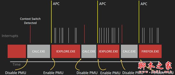 此外,为了进一步保证HA-CFI的效率,可以根据当前进程的重要性选择性的开启或关闭PMU,如当前进程为IE或Firefox浏览器时,开启PMU;若当前进程为Calc.exe这样不太容易遭受攻击的进程,则关闭PMU,如图所示: