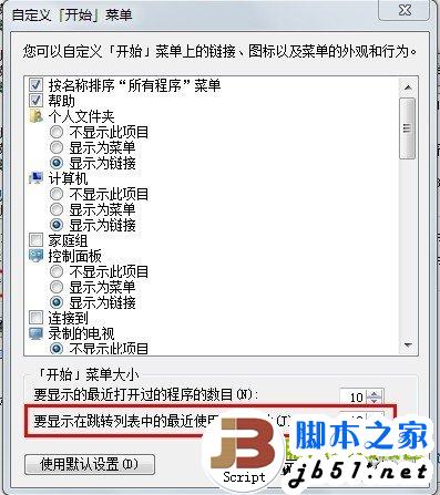 另外,跳转列表的显示数量也是可以手动更改的。还是这个选项卡中,点击“自定义”按钮。在新打开的窗口中,在下面的“要显示在跳转列表中的最近使用的项目数”选项处,可以随意进行设置,自己决定你的跳转列表长度。