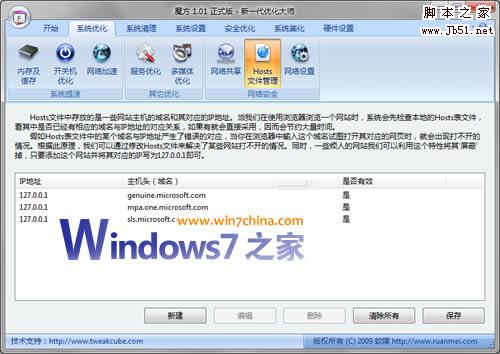 如果您是个懒人,那么,您可以使用魔方这款软件,下面附上操作截图。当然,Vista系统您也可以使用Vista优化大师,Windows7系统您也可以使用Windows7优化大师,里面都有hosts文件编辑功能,不过推荐魔方,毕竟是新一代的优化大师,做的最完善,也同时支持XP、Vista和Windows7系统。