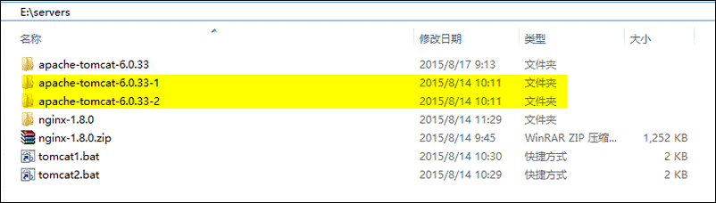 2、然后解压两个Tomcat,分别命名为apache-tomcat-6.0.33-1和apache-tomcat-6.0.33-2: