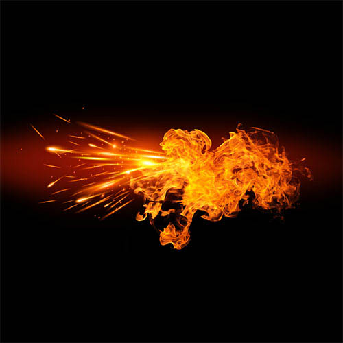 效果图中的文字部分并不复杂,为简单的立体字,用图层样式及手工复制就可以做好。火焰部分稍微有点复杂,用动感及火焰素材叠加,然后再加上火花及炫光等渲染出动感效果即可。