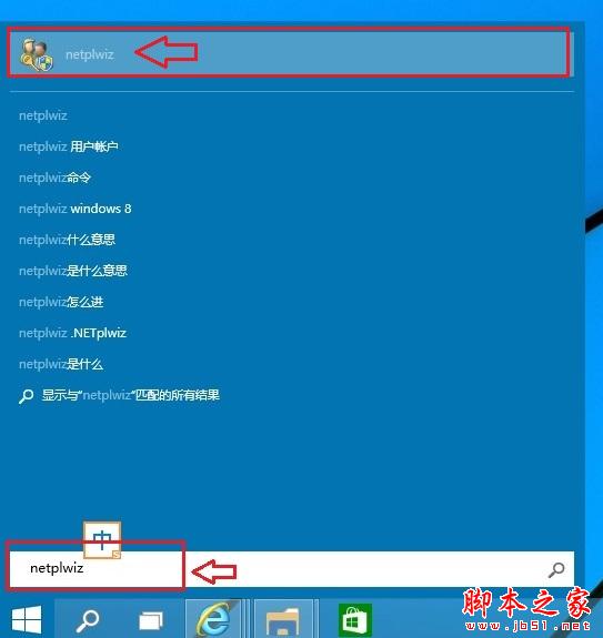 一、首先点击Win10桌面左下角的Windows开始图标,进入Win10开始菜单,打开开始菜单后,在底部搜索框中键入netplwiz命令,如下图所示: