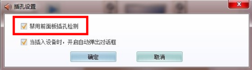 3、在弹窗中勾选“禁用前面板插孔检测”并单击“确定”。