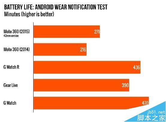 针对不同手表间续航时间进行的比较只能提供大致参考,因为手表不同于手机,不可能将它们的屏幕亮度调节至同一水平下。测试人员通过蓝牙连接,每间隔15秒便向手表发送一条消息并模拟一次屏幕点击,在这种情况下,尺寸为42mm的Moto 360凭借一块容量为300毫安时的电池坚持了近5小时。
