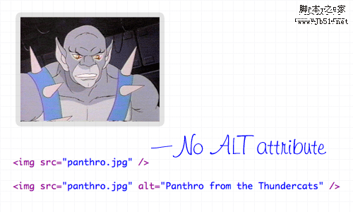 alt属性是所有显示在网页中图片的必须属性,它能够帮助人们知道这是什么图片.或者在网速比较慢的时候显示图片的含义是什么.它的主要目的是,说明图片的含义,想这样的说明 alt=”image”是很糟糕的.如果,有些图片的确只是装饰作用而已,那么建议你写成 alt=”".