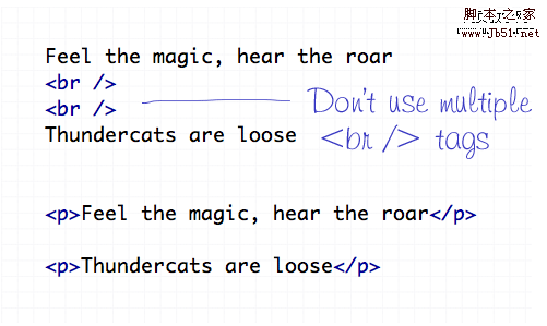 <br />换行标记只应该用于插入是在第一个文本流换行符敲到一个新行一个特别字了。它不应该被用来制造元素之间的差距,而是分裂成不同的段落,或调整的幅度CSS样式的文本。