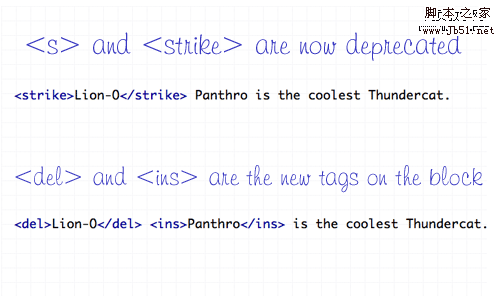 在昔日,<S>和<strike>允许用来定义网站文字。不过,现在他们被定义为不推荐使用的标签,当他们任然可以有效果.现在用新的标记集- <del>和<ins>。来替换<s><strike>