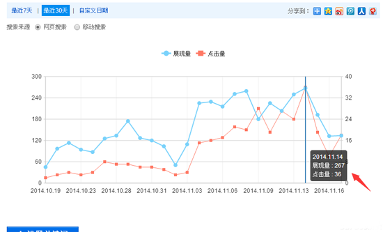 上图为某公司网站2014-10-19至2014-11-16的搜索展现量与点击量曲线图,在图中11月14日展现量和点击量是一个月内最高的一天,展现量为267次,点击量为36次,点击率为13% 这样的点击率是非常低的,造成此结果有2个原因。