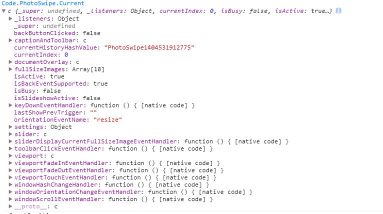 虽然不能完全看懂里面是什么,但是能看到其中有Current这个元素,接着在控制台输入Code.PhotoSwipe.Current,得到下面的内容: